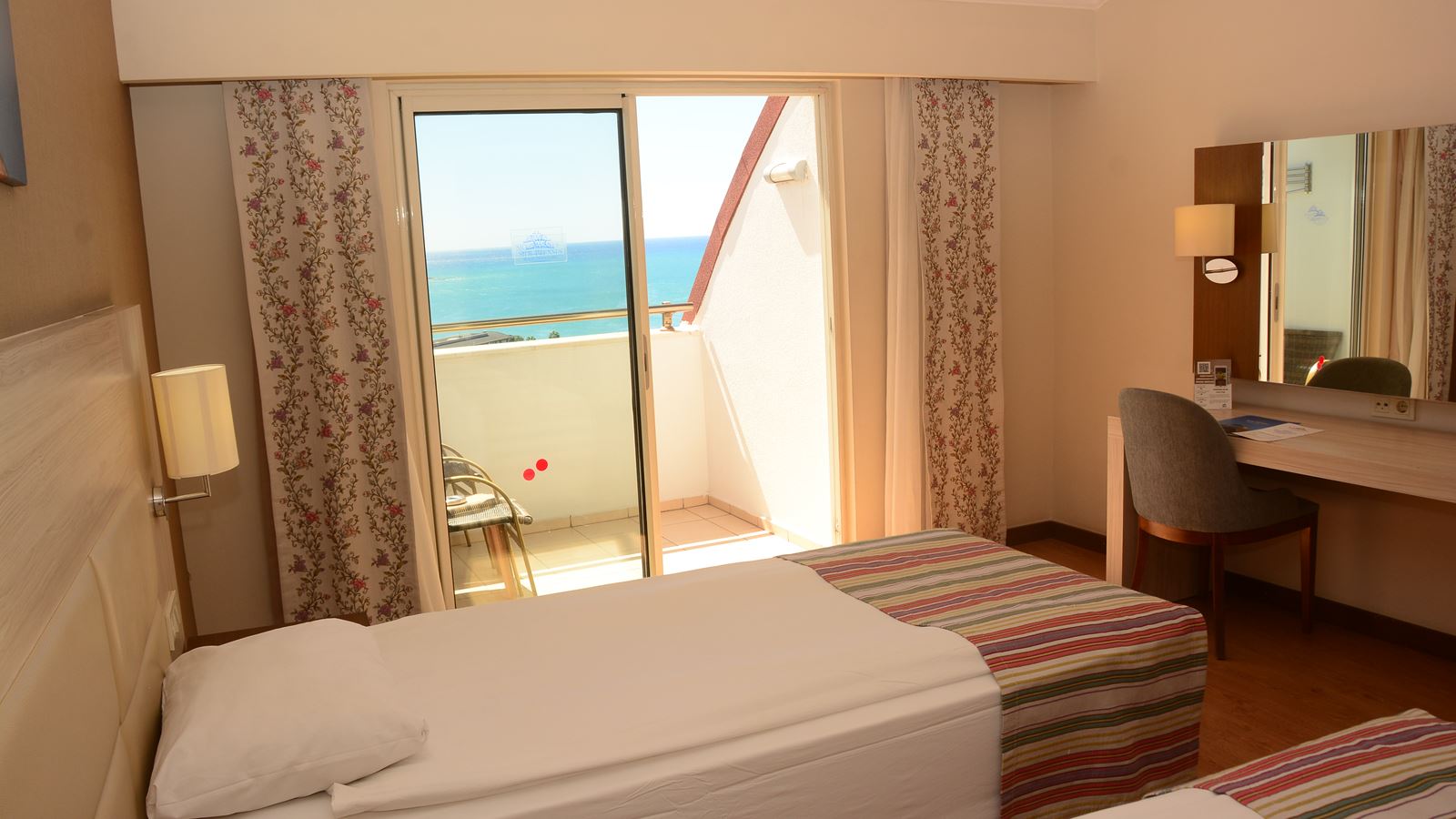 | Standard Sea View | Kokku tube: 93 Toa suurus: 18 - 30 ruutmeetrit 1 magamistuba (Double bed: 1, Single bed: 2) Vannitoad: 1 (Dušš) WC-d: 1 Rõdu Merevaade Õhukonditsioneer (töötab perioodil: Märts, Aprill, Mai, Juuni, Juuli, August, September, Oktoober, November, Detsember, 24 tundi) TV, kanalid: Inglise Tee või kohvi võimalus Minibaar toas (Igapäevane; jaoks "All Inclusive" Tasuta) Juhtmevaba/internett (Tasuta) Seif toas (Tasuta) Laminaat Igapäevane Telefon Toad asuvad korrustel: 1,2,3,4,5,6 Lisavoodi: Normaalne Maksimaalne täituvus: Täiskasvanutest kuni 3, lapsed kuni 1; Inimesi kokku: kuni 3 |